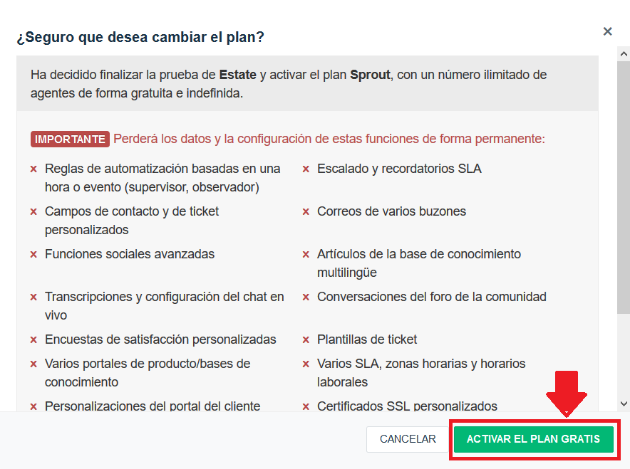 3. Hacer clic en Escoger Plan, nos saldrá otra ventana para confirmar la activación del mismo. Hacer clic en ACTIVAR EL PLAN GRATIS.
